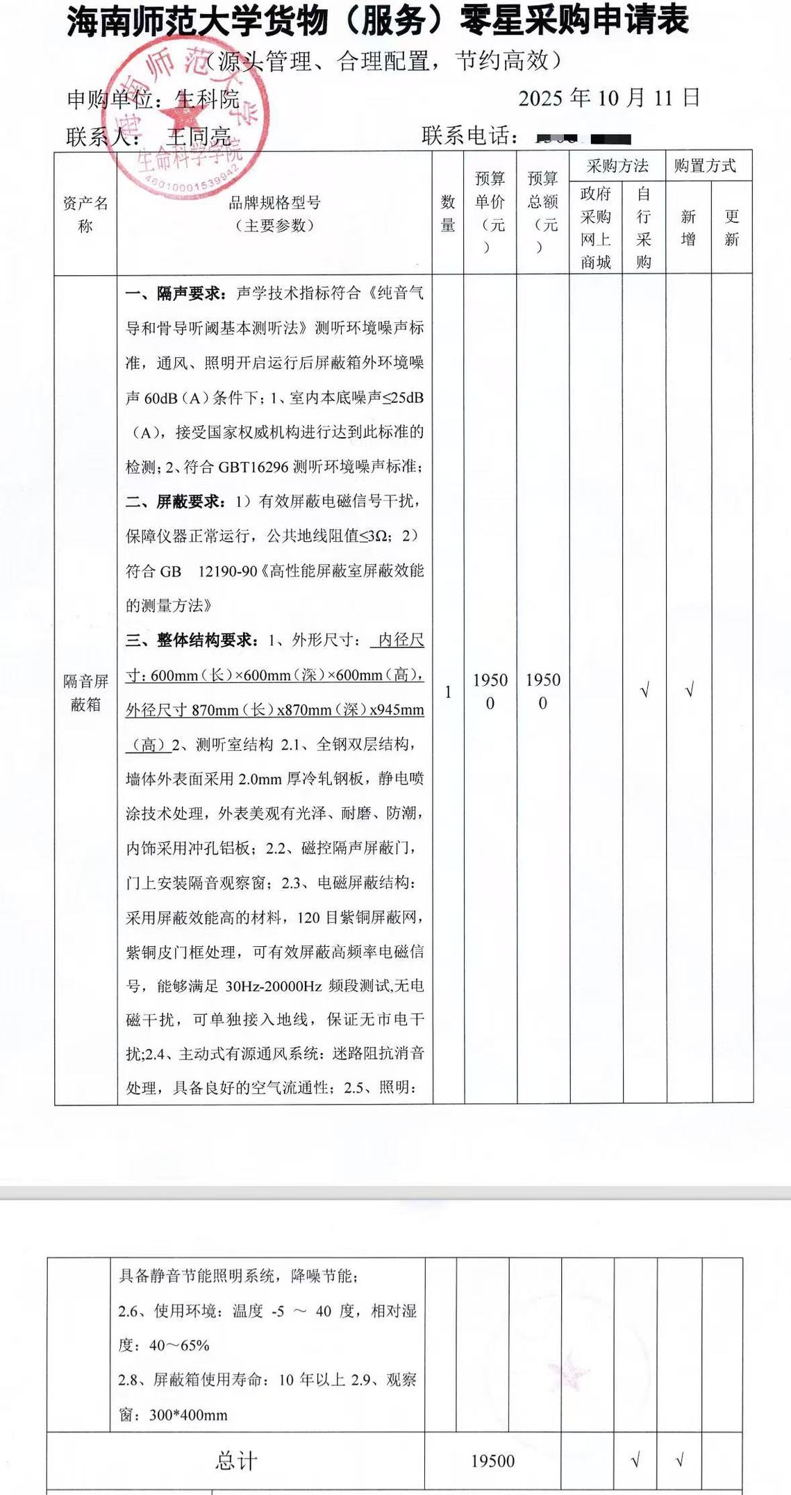 因科研工作需要,需购置隔音屏蔽箱1台。根据学校相关规定,现将具体采购信息公示如下: