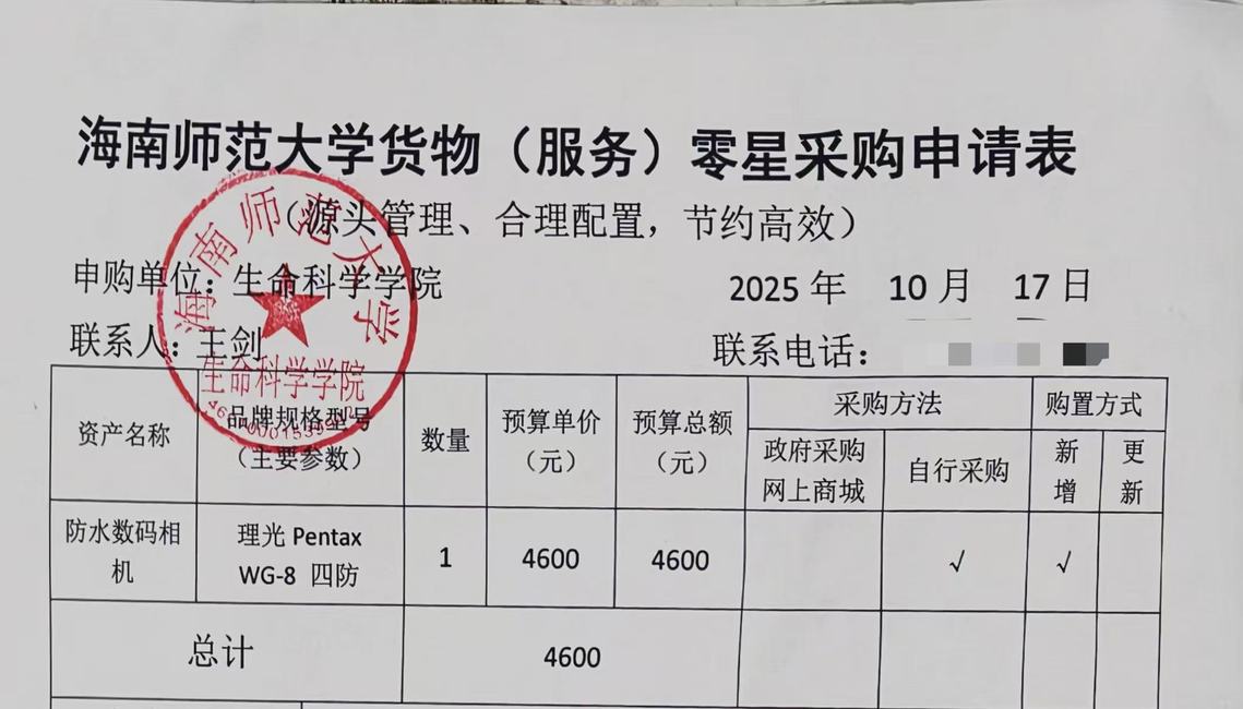 因个人科研工作需要,需购置防水数码相机1台。根据学校相关规定,现将具体采购信息公示如下: