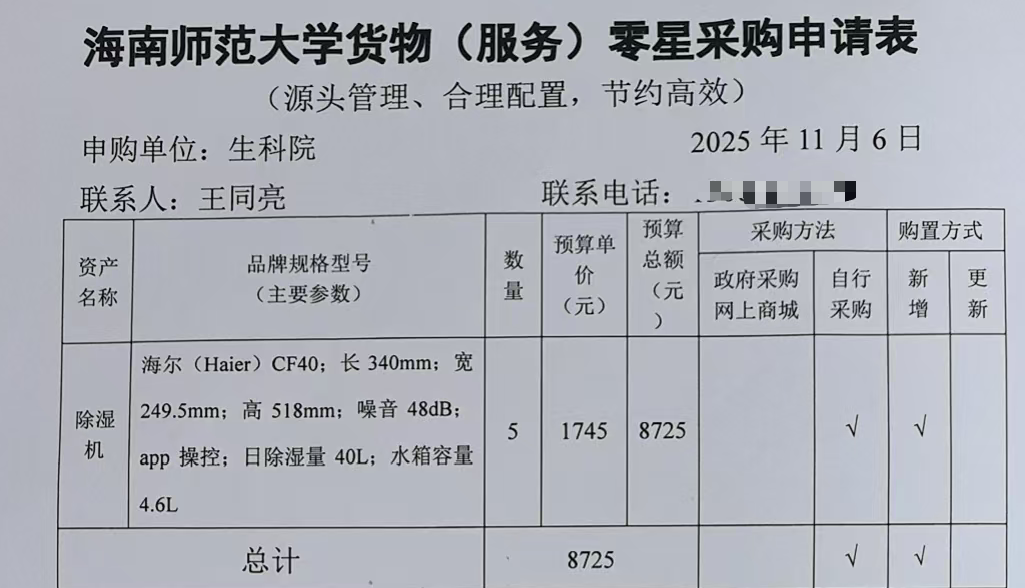 因教学科研工作需要,需购置除湿机5台。根据学校相关规定,现将具体采购信息公示如下: